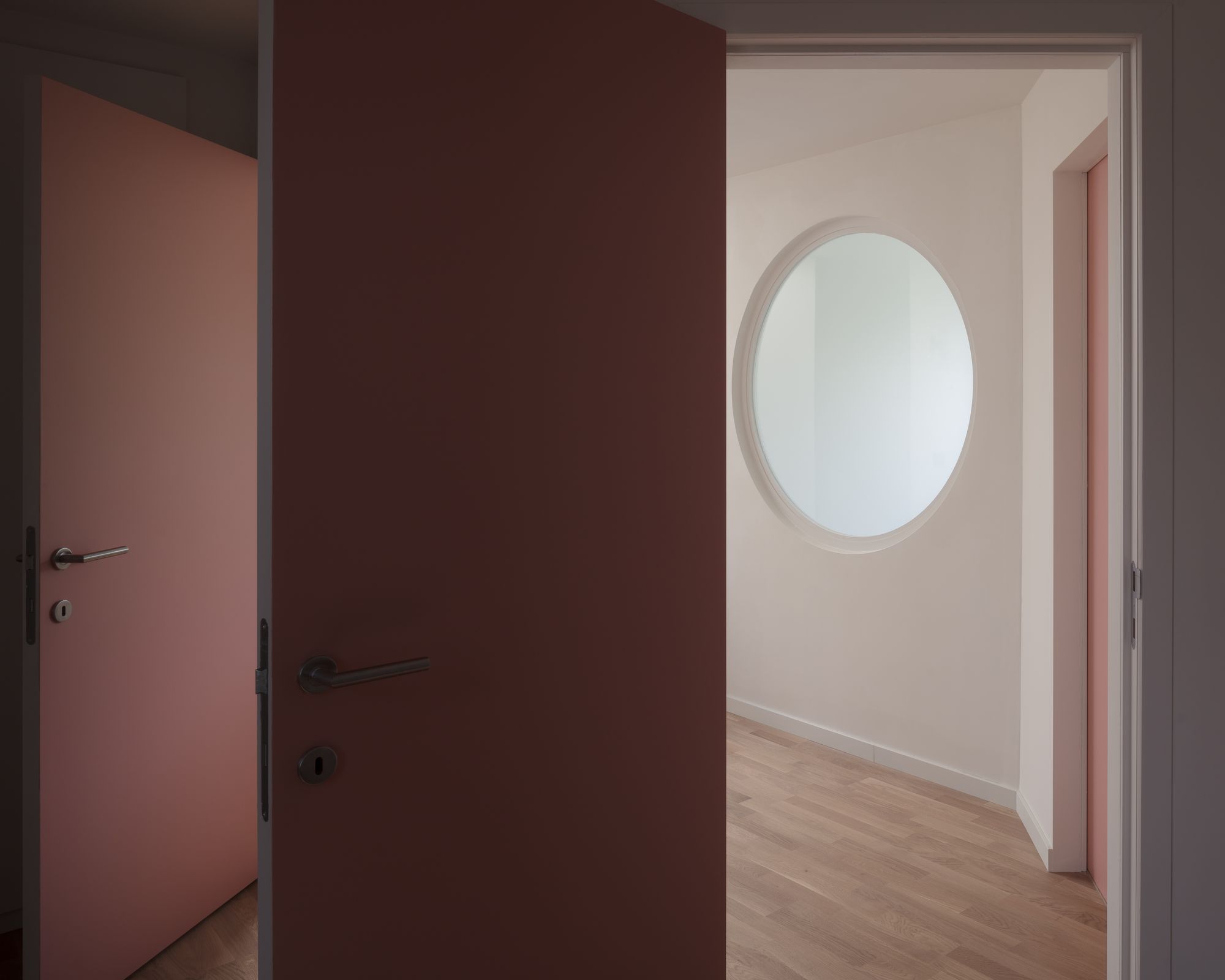 A House with a Hat is a minimal residence located in Ghent, Belgium, designed by FELT. A detached single-family home is made longer by FELT by including a hat-shaped second floor. Three bedrooms and a bathroom are located on the first floor of the house. A double-height dining area with a whimsical barrel vaulted ceiling connects the two levels.