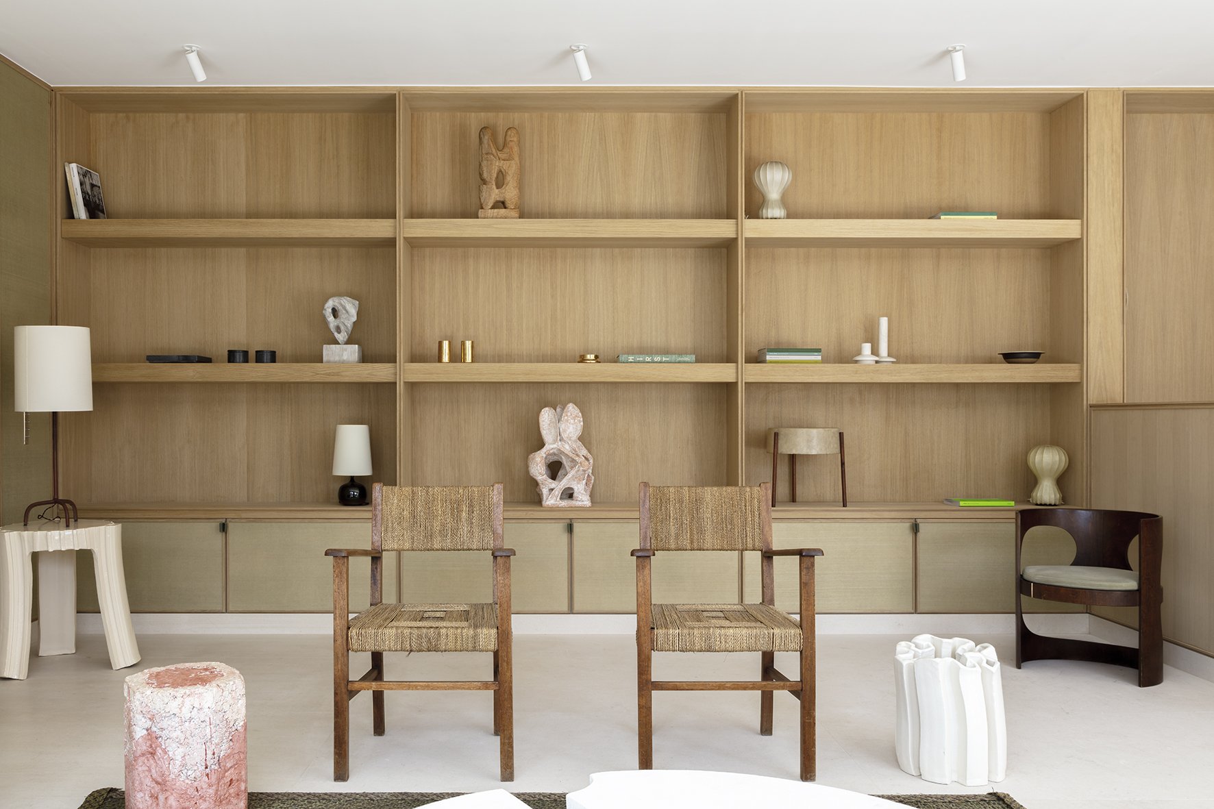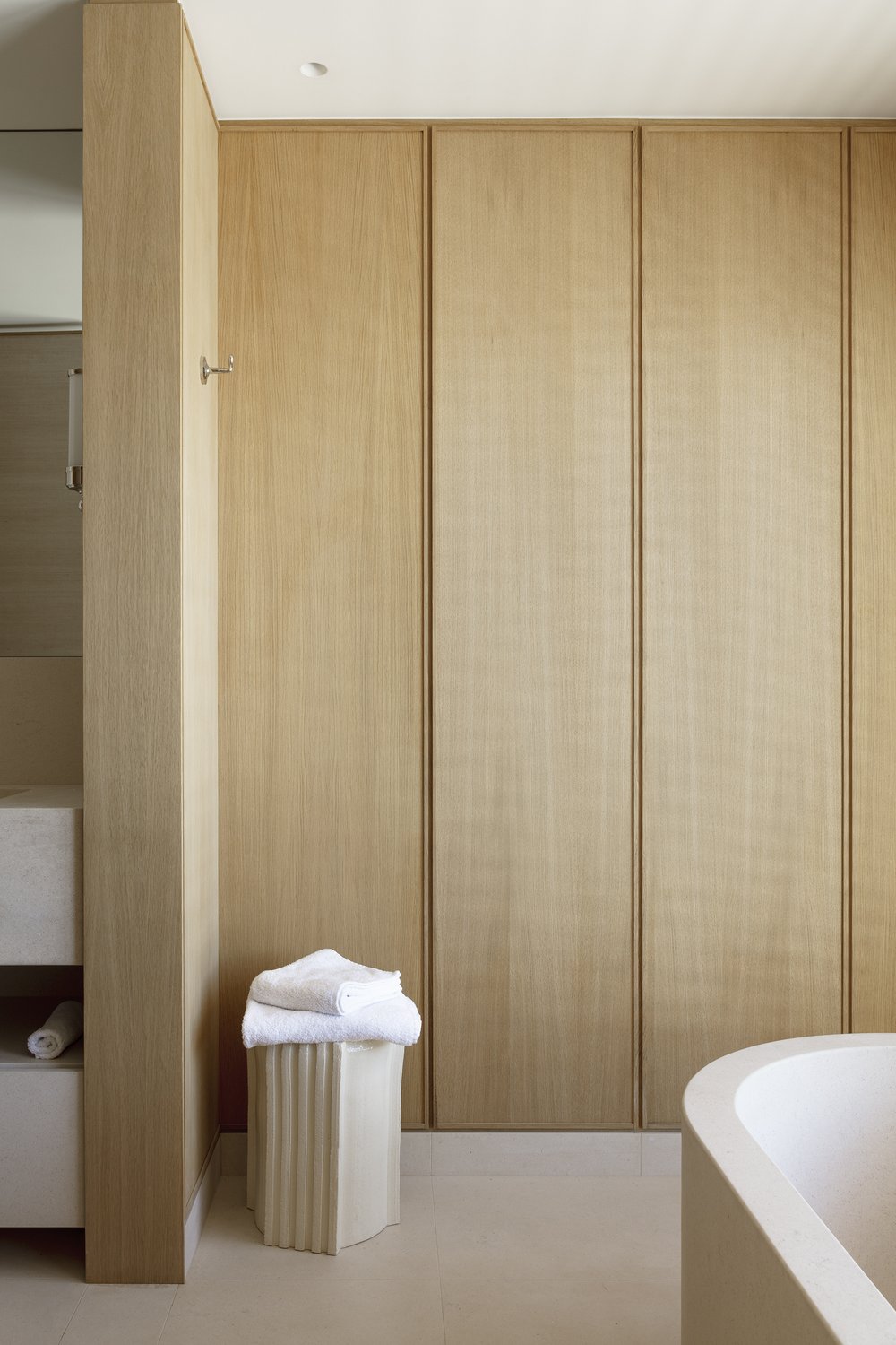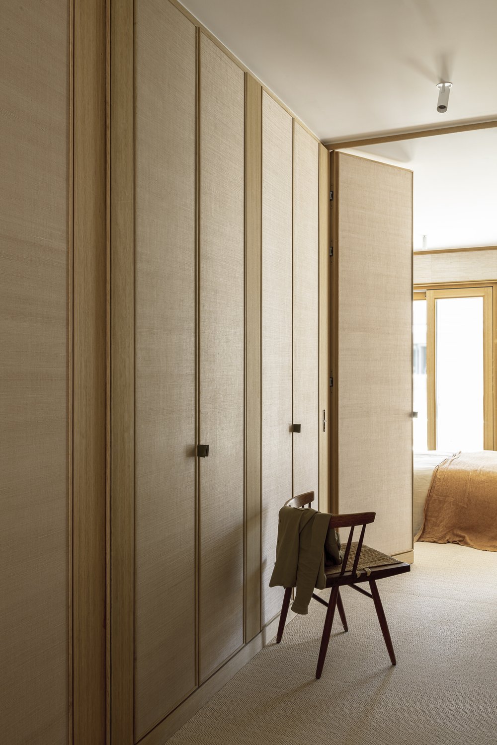 Montaigne is a minimal space located in Paris, France, designed by AFTER BACH. Soft, neutral tones and warm minimalism adorn the space with oak paneled walls providing texture. Natural materials are used throughout the two-story apartment, mixing in vintage furniture with contemporary pieces. The space feels airy and light, with large glazings facing the Eiffel Tower, bringing in abundant natural illumination to the main living areas.