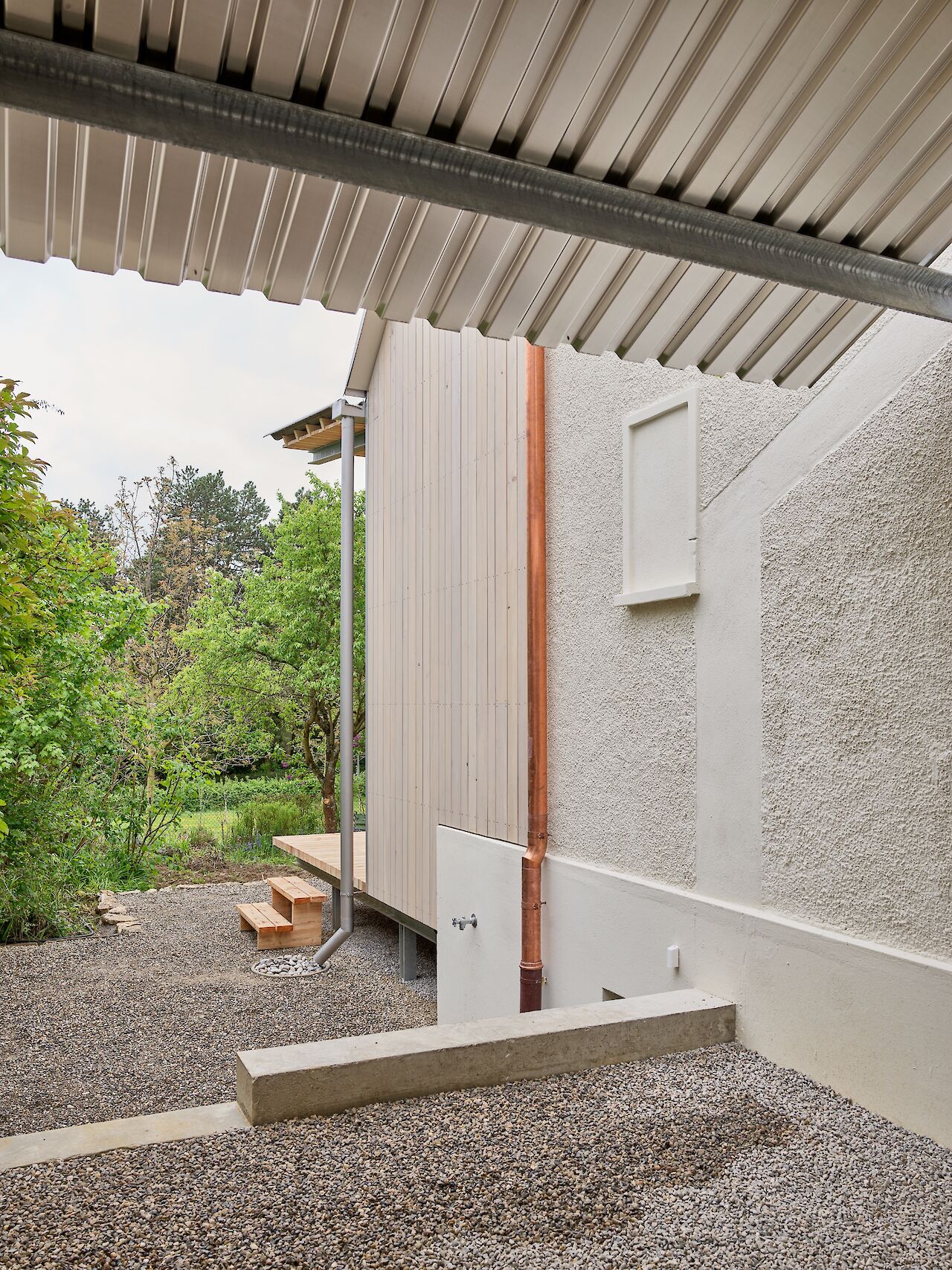 Peter Ochs-Strasse is a minimal extension located in Basel, Switzerland, designed by Felippi Wyssen Architects. The extension features a lifted balcony constructed of metal and wood, which are reflected in the corrugated metal roofing sitting atop the wooden overhang. The roof extension is augmented into skylights within the interior to provide additional natural light.