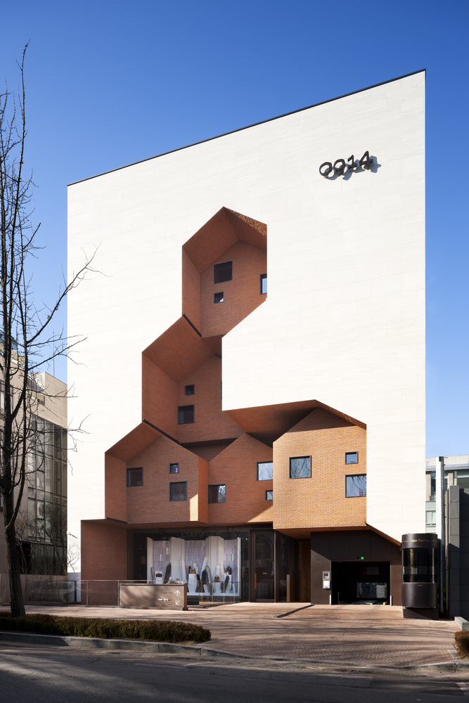 TRU Architects와 Eho가 설계를 맡은 이 건물은 '마을(Village)'을 핵심 콘셉트로 삼았습니다. 이는 숙련된 가죽 장인과 신진 디자이너가 함께 작업하며 시너지를 내는 시몬느의 '협업 문화'를 공간적으로 구현한 것입니다. 건축 외관은 순백의 박스 안에 붉은 벽돌 집들이 쌓여 조각된 듯한 형태를 띠며, 이러한 대비는 내부에서 상점과 스튜디오로 쓰이는 박공지붕 집들이 돌출된 형태로 이어집니다.