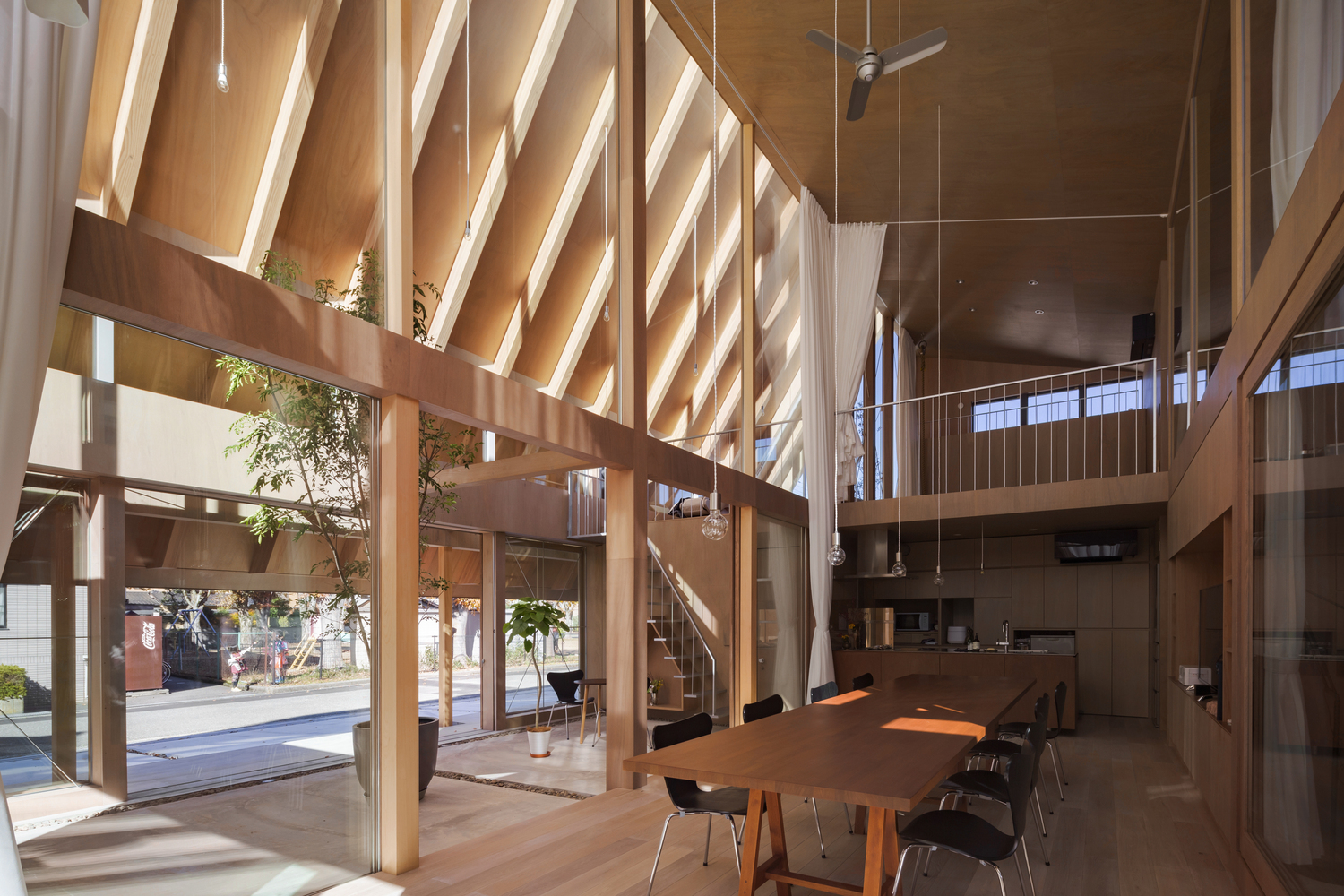 이 집의 가장 큰 특징은 전통적인 접객 공간인 '토방(Doma)'을 거대한 지붕이 덮인 '실내 정원'으로 변모시킨 것입니다. 이 공간은 비가 오거나 추운 겨울에도 거주자가 외부의 자연을 실내에서 안전하게 즐길 수 있도록 합니다. 지붕은 계절에 따라 빛의 유입을 조절하여 여름에는 시원하고 겨울에는 따뜻한 열 환경을 조성하며, 아침에는 깊은 햇살을 끌어들여 공간에 생동감을 줍니다.