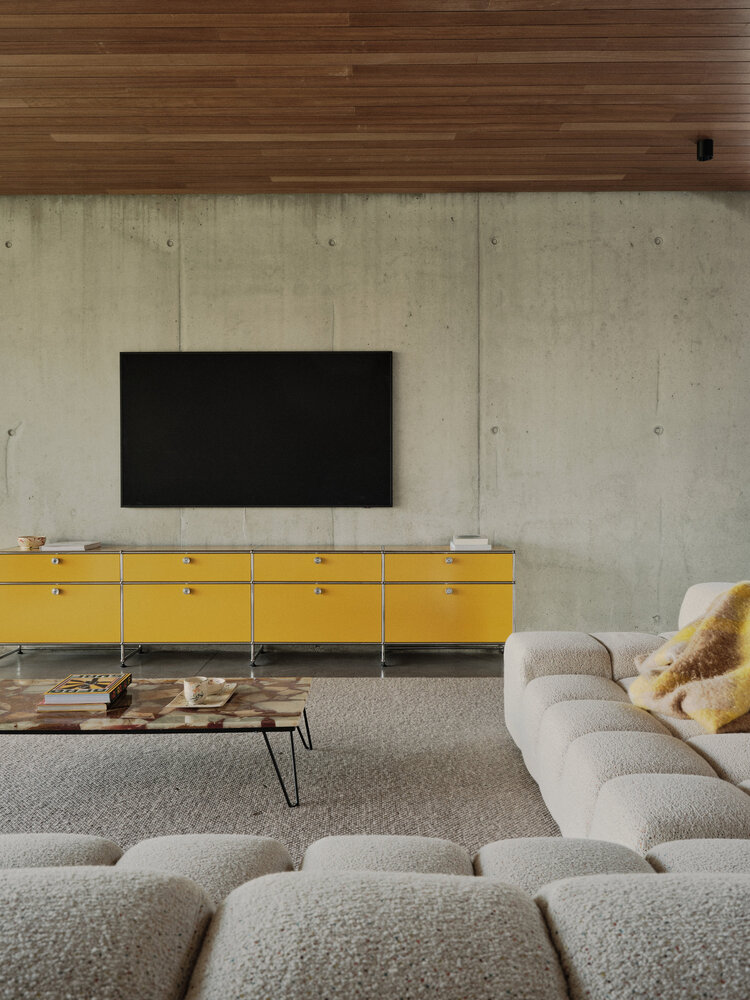 - L자형 평면과 열린 시야: 생활공간과 안방이 있는 '동서 윙'과 게스트룸이 있는 '남북 윙'이 입구를 중심으로 L자형으로 결합합니다. 입구에서는 닫힌 벽체와 열린 공간의 영리한 상호작용을 통해 바다 풍경이 한눈에 들어오도록 설계되어 풍경과의 연결성을 극대화했습니다.
